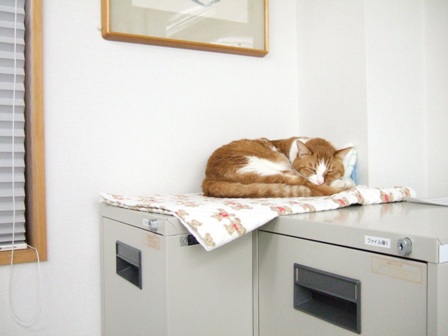 朝ごはんを食べて、朝の恒例になってしまった、おやつのカニカマ(ダイエットのために一人に付き一筋のみ)をもらった後は、こんな調子で私の席の後ろにある、お気に入りのファイル庫の上で寝ています。でも時々来客の方の顔を見に打ち合わせテーブルまで出て来ます。特に銀行の方が大好きのようで銀行名は関係なく気になるようです。時折、かばんに顔をつっこんで中身をチェックするのでハラハラします。(そういう時にかぎって現金は無いそうですが。お金の匂い大好き!?)