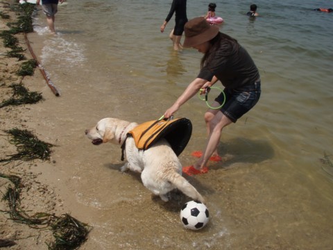 ライアンは着いてから海どころか、メス犬のラブラドールが気になって仕方がありません。