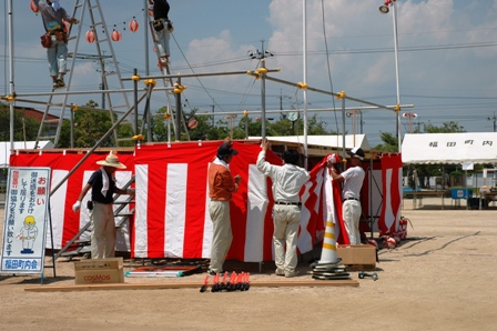 ちょうちんも次々と飾りつけができ、やぐらの下では、職人さんたちが、幕張りをしてました。これをすることで見栄えよく祭りの雰囲気がでてきました。