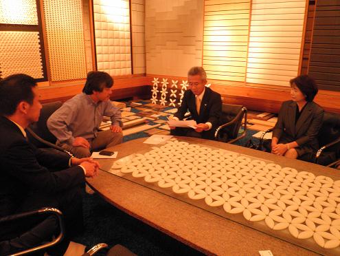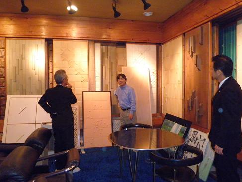 虔山の山本社長さんとマンションのアクセントタイルについてお打合せです。