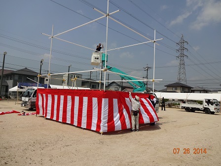 『やぐら』に紅白幕を張っています。