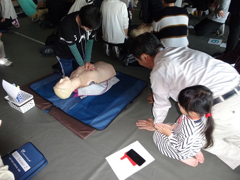 今日は、市民のための救命講習会へ行ってきました。いざというときの心肺蘇生法とAEDの使い方を学ぶ講習会で、秦建設から6名+幼児2名で参加しました。