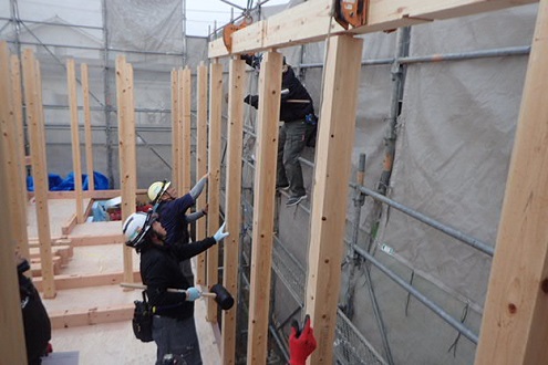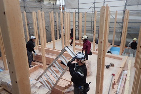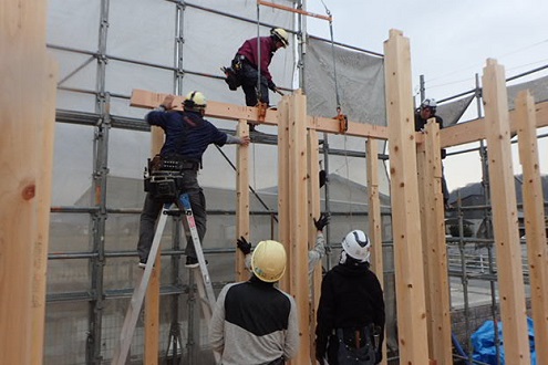 柱建て込み後、梁かけ作業を行っています。