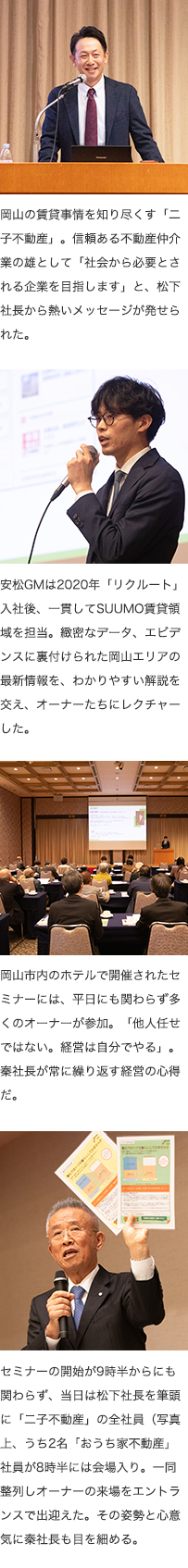 「今より、高い家賃がいただけますか?わが家のマンション」。そう問われた時、オーナーとして何を成すべきか。セミナーの本題はそこに集約された。経営に熱心な「秦建設」マンションオーナーによるリアルな体験談、「二子不動産」松下社長による直近の賃貸市場の動向や仲介会社としての取り組み、そして「リクルート中国・四国G」安松GMによる岡山の現況、データから読み取る賃料や募集条件の動向など、会場のオーナーたちも聞き逃すまいと耳を傾ける。