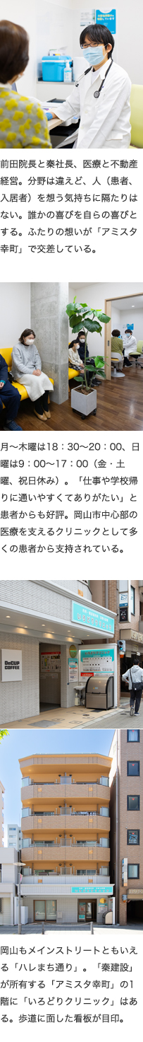 人気のパン屋やショップが軒を連ね、平日はビジネスマン、週末には若者や家族連れで華やぐ「ハレまち通り」。その中ほどにある「秦建設」が手がけた賃貸マンション「アミスタ幸町」の一階に「いろどりクリニック」の明かりは灯る。院長・前田英紀さんは現在四十一歳。日本糖尿病学会糖尿病専門医として研鑽を積み、糖尿病をはじめとする生活習慣病から日々の体調不安まで、患者一人ひとりに寄り添った診療を続けている。「街の中心を選んだのは、忙しさに追われ、自分の体のことを後回しにしてしまいがちな方が、仕事帰りや休日にふと立ち寄れる場所にしたかったからです」。前回の取材時に、そう語ってくれた前田院長の言葉には、医師としての使命感と、生活者への優しいまなざしがにじんでいた。